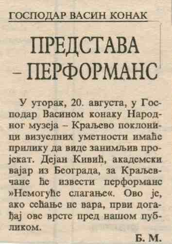 Б. М., „Представа – перформанс”, Ибарске новости, 15. август 1996, 7. (izvor: Narodni muzej Kraljevo)