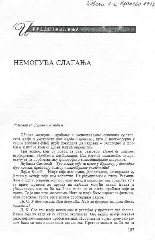 Љубиша Симовић, „Немогућа слагања – Разговор са Дејаном Кивићем”, Повеља, 1-2, 1997. (izvor: Narodni muzej Kraljevo)