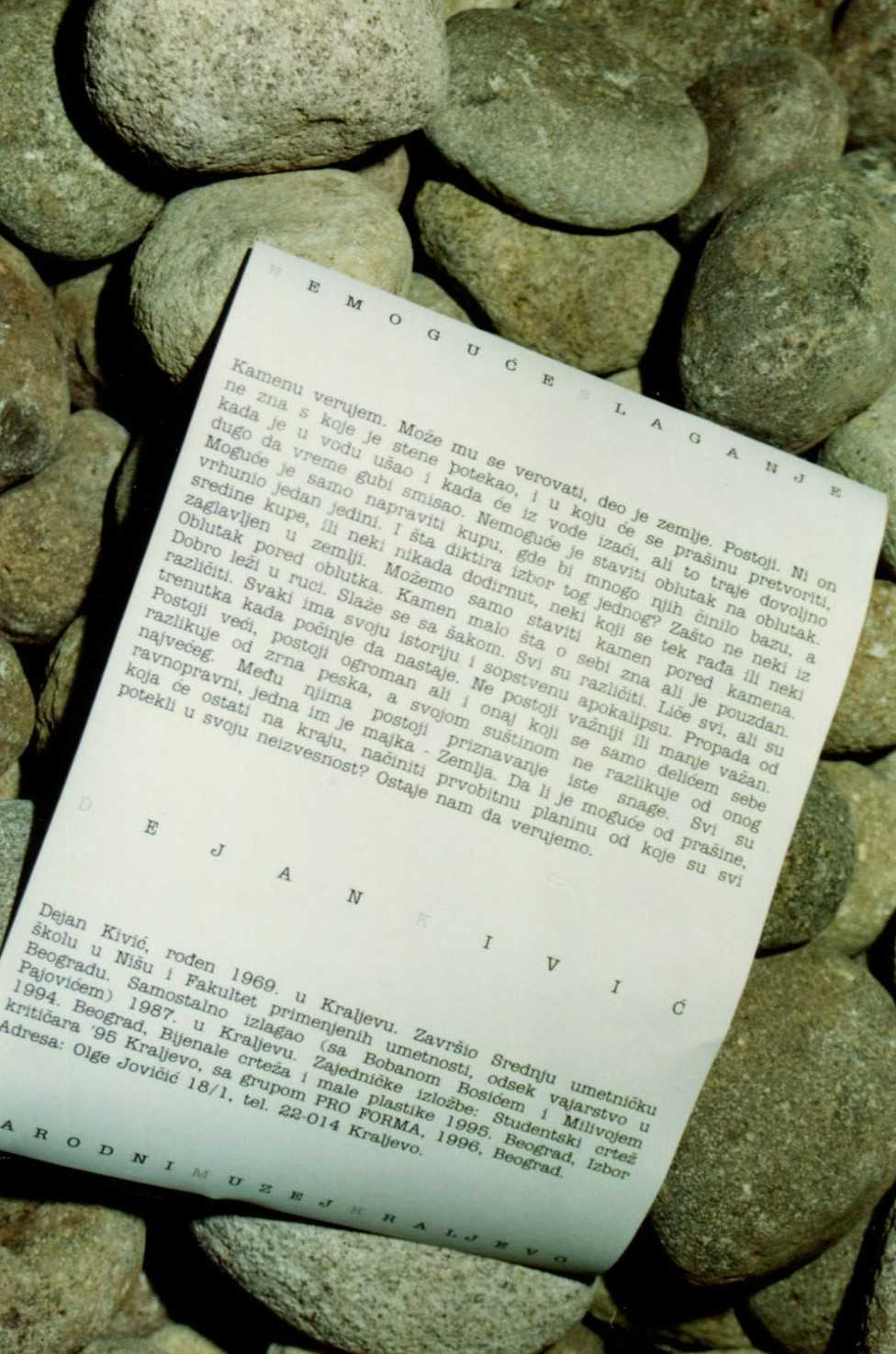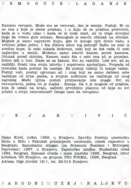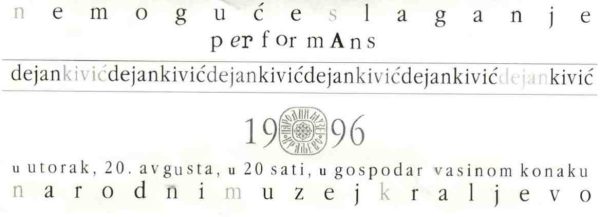 Pozivnica, Dejan Kivić: nemoguće slaganje: performans, Gospodar Vasin konak, Narodni muzej Kraljevo, 20. avgust 1996. (izvor: Narodni muzej Kraljevo)