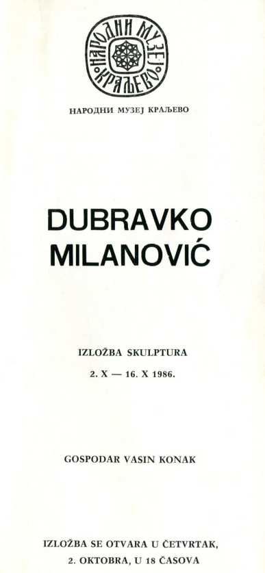 Dubravko Milanović: izložba skulptura, Gospodar Vasin konak, Narodni muzej Kraljevo, 2–16. oktobar 1986. (izvor: Narodni muzej Kraljevo)
