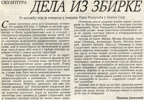 Izložba skulptura: dela autora iz zbirke, Galerija likovne umetnosti poklon zbirka Rajka Mamuzića, Novi Sad, april 1992. (izvor: Galerija likovne umetnosti poklon zbirka Rajka Mamuzića, Novi Sad)