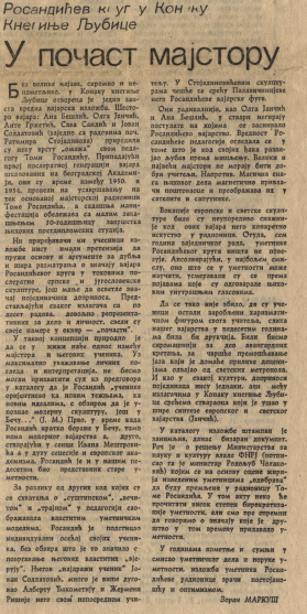 Зоран Маркуш, „У почаст мајстору”, Политика, 22. јун 1985. (izvor: Muzej grada Beograda)