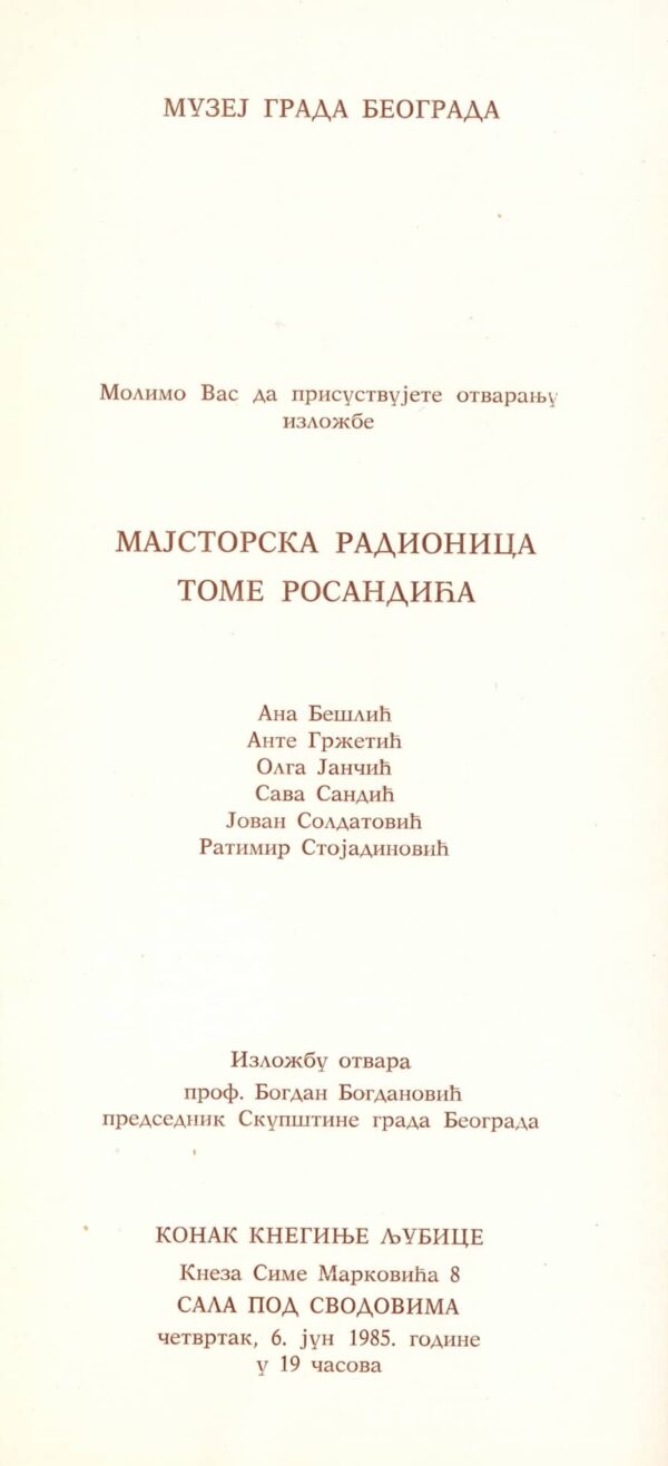 Pozivnica, Majstorska radionica Tome Rosandića, Muzej grada Beograda (izložba je održana u Konaku kneginje Ljubice), 6. jun 1985. (izvor: Muzej grada Beograda)