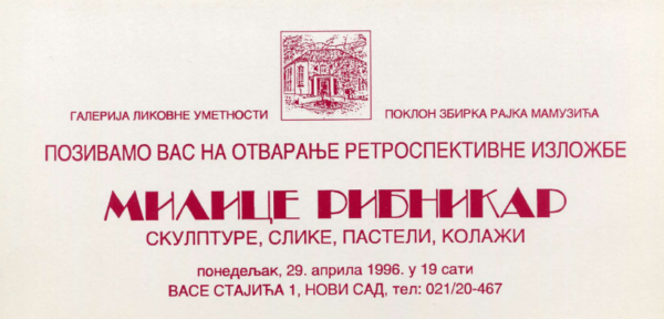Милица Рибникар: скулптуре, слике, пастели, колажи; Галерија ликовне уметности поклон збирка Рајка Мамузића, Нови Сад, април–јун 1996. (izvor: Galerija likovne umetnosti poklon zbirka Rajka Mamuzića, Novi Sad)