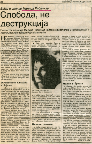 Олга Боснић, „Слобода, не деструкција”, Политика, 8. јун 1996. (izvor: Galerija likovne umetnosti poklon zbirka Rajka Mamuzića, Novi Sad)