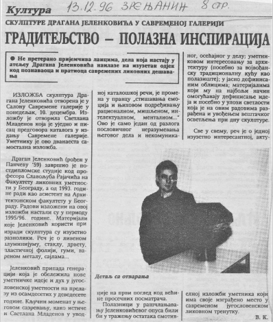 В. K., „Градитељство – полазна инспирација”, Зрењанин, 13. децембар 1996, 8. (izvor: Savremena galerija Zrenjanin)