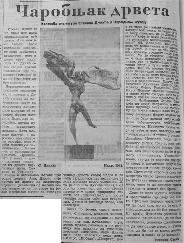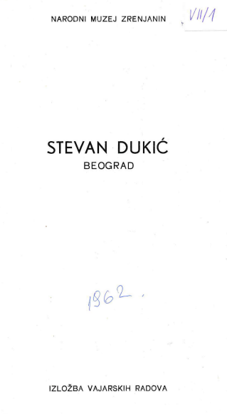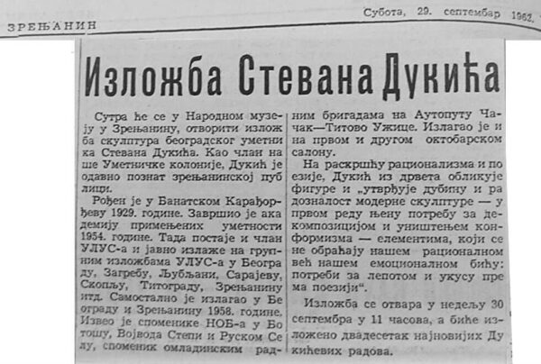 Stevan Dukić: izložba vajarskih radova, Galerija umetničke kolonije, Zrenjanin (izložba je održana u Narodnom muzeju, Zrenjanin), 30. septembar 1962. (izvor: Savremena galerija Zrenjanin)