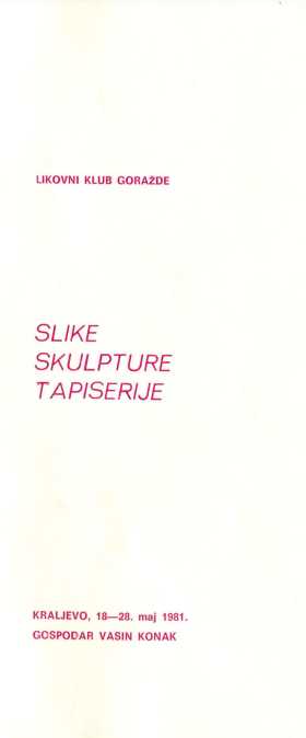 Likovni klub Goražde: slike, skulpture, tapiserije, Gospodar Vasin konak, Kraljevo, 18–28. maj 1981. (izvor: Narodni muzej Kraljevo)