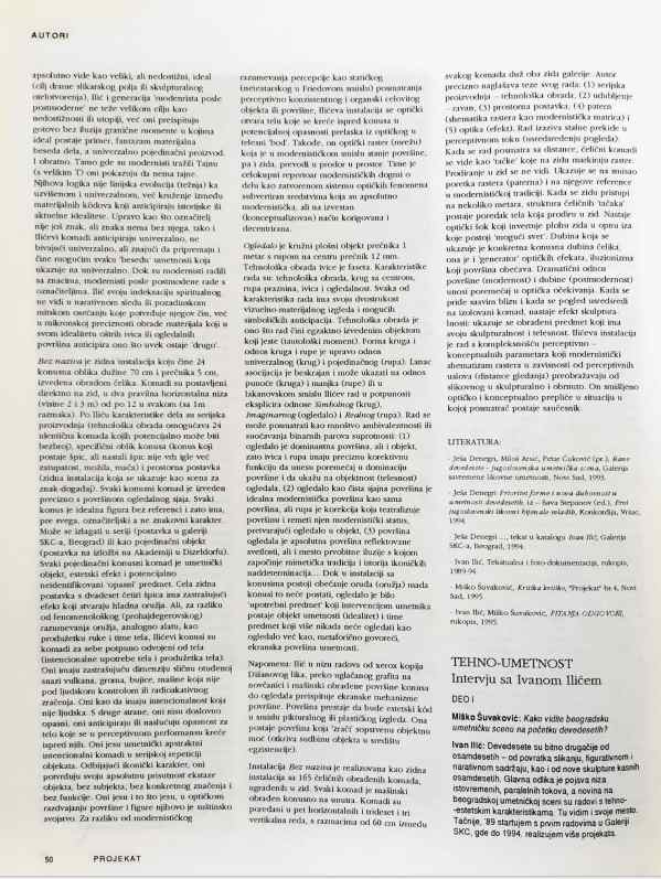 Miško Šuvaković, „Tehno-umetnost/ Intervju sa Ivanom Ilićem”, Projeka(r)t: časopis za vizuelne umetnosti Galerije savremene likovne umetnosti, Novi Sad, broj 5, avgust 1995, 50-51. (izvor: Muzej savremene umetnosti Vojvodine, Novi Sad)
