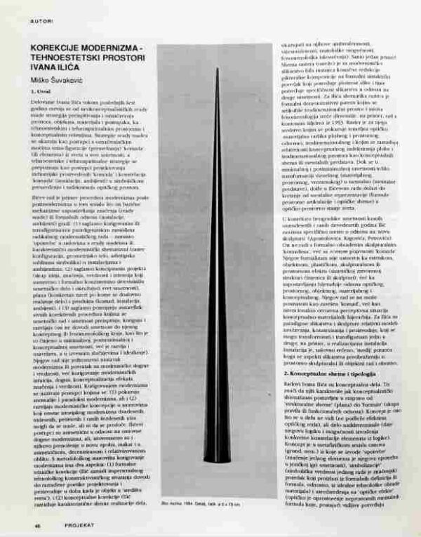 Miško Šuvaković, „Korekcije modernizma – tehnoestetski prostori Ivana Ilića”, Projeka(r)t: časopis za vizuelne umetnosti Galerije savremene likovne umetnosti, Novi Sad, broj 5, avgust 1995, 46-50. (izvor: Muzej savremene umetnosti Vojvodine, Novi Sad)