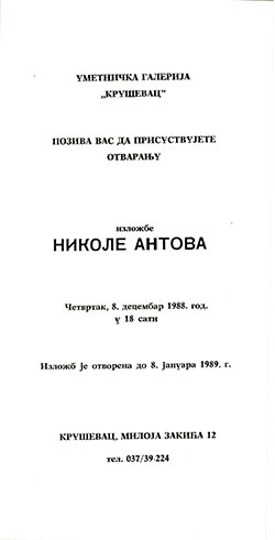 Pozivnica, Nikola Antov: skulpture, Umetnička galerija, Kruševac, 8. decembar 1988. (izvor: Umetnička galerija, Narodni muzej, Kruševac)