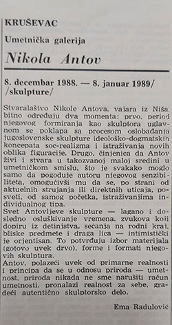 Ema Radulović, „Nikola Antov”, Likovni život, septembar 1989. (izvor: Umetnička galerija, Narodni muzej, Kruševac)