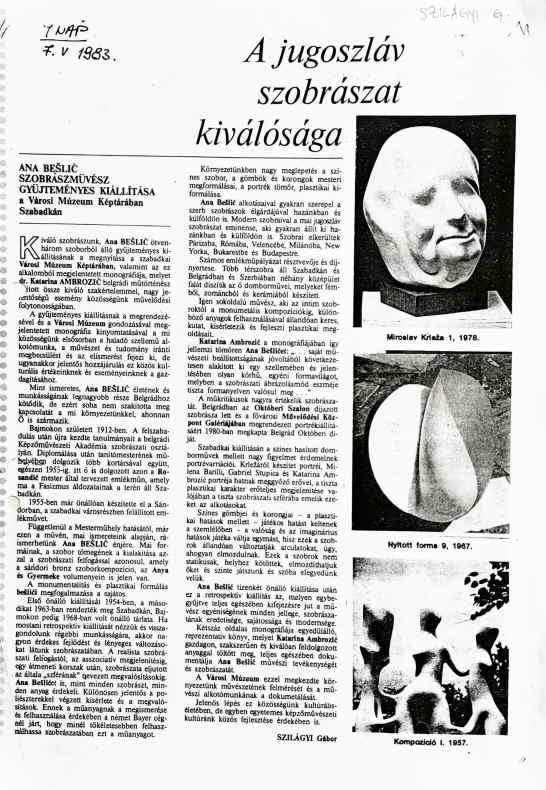 Szilágyi Gábor, „A yugoszláv szobrászat kiválósága”, 7 Nap, 7. maj 1983. (fotokopija; izvor: Gradski muzej Subotica)