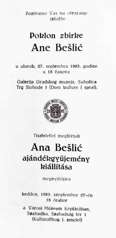 Poklon zbirka Ane Bešlić Gradskom muzeju u Subotici / Ana Bešlić ajándékgyűjteménye a Szabatkai városi Múzeumnak, Gradski muzej Subotica, 27. septembar – 9. oktobar 1983. (izvor: Gradski muzej Subotica)