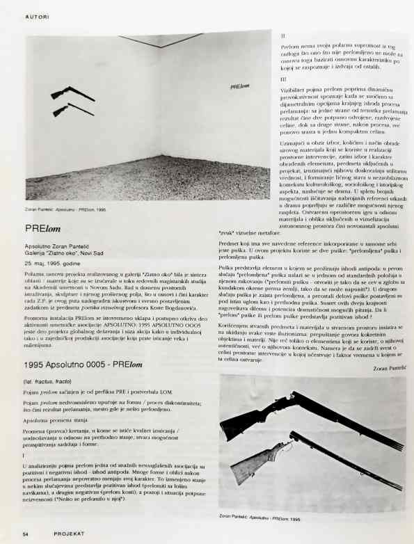 Zoran Pantelić, „PRElom”, Projeka(r)t: časopis za vizuelne umetnosti Galerije savremene likovne umetnosti, Novi Sad, broj 5, avgust 1995, 54. (izvor: Muzej savremene umetnosti Vojvodine, Novi Sad)