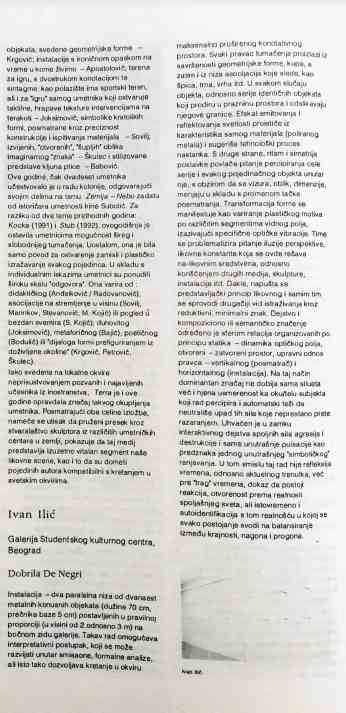Dobrila De Negri, „Ivan ilić”, Projeka(r)t: časopis za vizuelne umetnosti Galerije savremene likovne umetnosti, Novi Sad, broj 3, jul 1994, 90. (izvor: Muzej savremene umetnosti Vojvodine, Novi Sad)