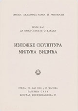 Pozivnica za otvaranje izložbe Miluna Vidića u Galeriji srpske akademije nauka i umetnosti, 25. maja 1988. (izvor: Srpska akademija nauka i umetnosti, Beograd)