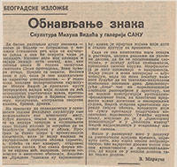 Б. Б., „Скулптуре Милуна Видића”, Политика, Београд, 25. мај 1988. (izvor: Srpska akademija nauka i umetnosti, Beograd)