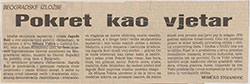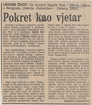 Momčilo Stojanović, „Pokret kao vjetar”, Večernji list, Zagreb, 29. jun 1988. (izvor: Srpska akademija nauka i umetnosti, Beograd)