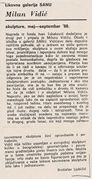 Bratislav Ljubišić, „Milun Vidić: skulpture, maj–septembar ’88”, Likovni život, Zemun, jun 1988, br. 3, str. 1. (izvor: Srpska akademija nauka i umetnosti, Beograd)